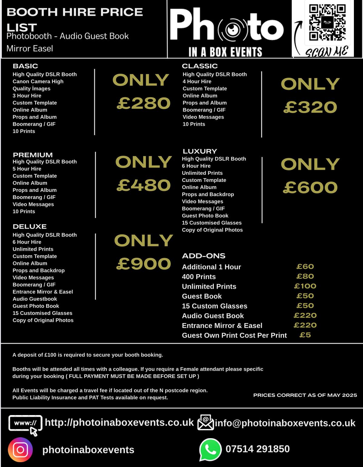 Where we specialize in providing professional and stylish photo booth hire services for all your special occasions. Our state-of-the-art booths are designed to enhance your event, capturing memorable moments with ease and elegance. Why Choose Us? At Photo In a Box Events we pride ourselves on delivering a seamless experience from start to finish. Our friendly, experienced staff will ensure that your photo booth is set up and ready to go, allowing you and your guests to enjoy the festivities without any hassle. Features - **High-Quality Images:** Our photo booths are equipped with top-of-the-line cameras and printers, ensuring that you receive high-resolution prints that last. - **Customizable Options:** Personalize your photo booth experience with a selection of backdrops, props, and custom branding to match your event theme. - **Instant Sharing:** Guests can easily share their photos online through social media or email, creating lasting memories in a modern way. Perfect for Any Event Whether you're planning a wedding, birthday party, corporate event, or any gathering, our photo booth hire services will add a touch of fun and sophistication that your guests will love. ### Get Started Today! Ready to make your event unforgettable? Contact us at 07514 291850 or fill out our online form to get a quote. Let us help you create beautiful memories that you and your guests will cherish forever. Visit our website at https://photoinaboxevents.co.uk to learn more about our services and book your photo booth today!
